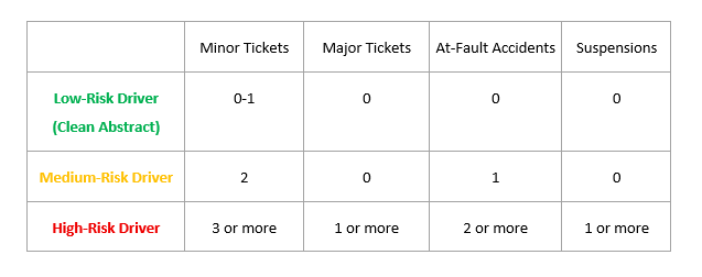 • Low-risk (clean abstract): no more than one minor ticket and zero at-fault accidents.